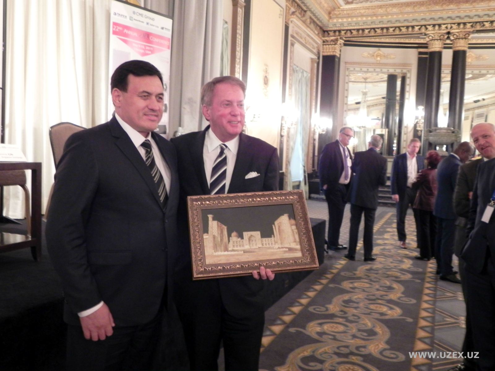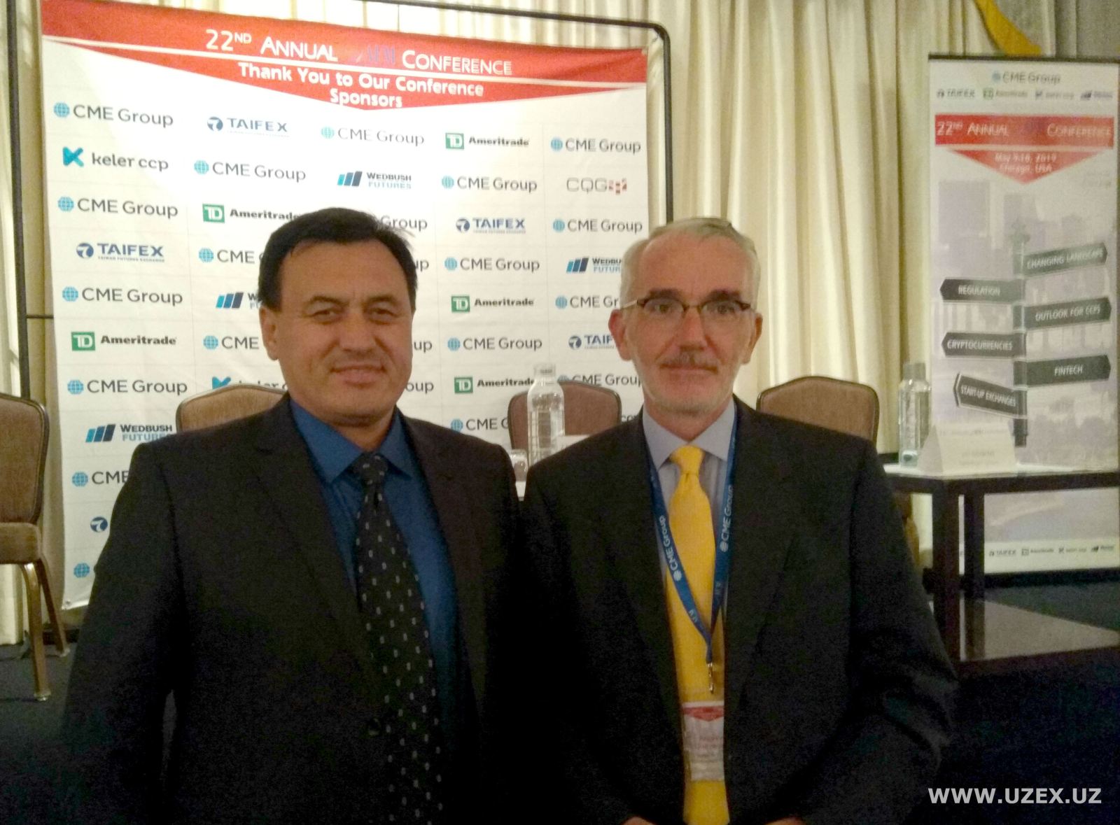 На мероприятии состоялась ознакомительная встреча Председателя Правления АО «УзРТСБ» Фарохидина Ибрагимова с Председателем и Генеральным директором Группы Чикагской товарной биржи (CME Group) Терри Даффи, по итогам которой достигнута договоренность об информационном взаимодействии двух бирж в области обучения фьючерсной торговле.